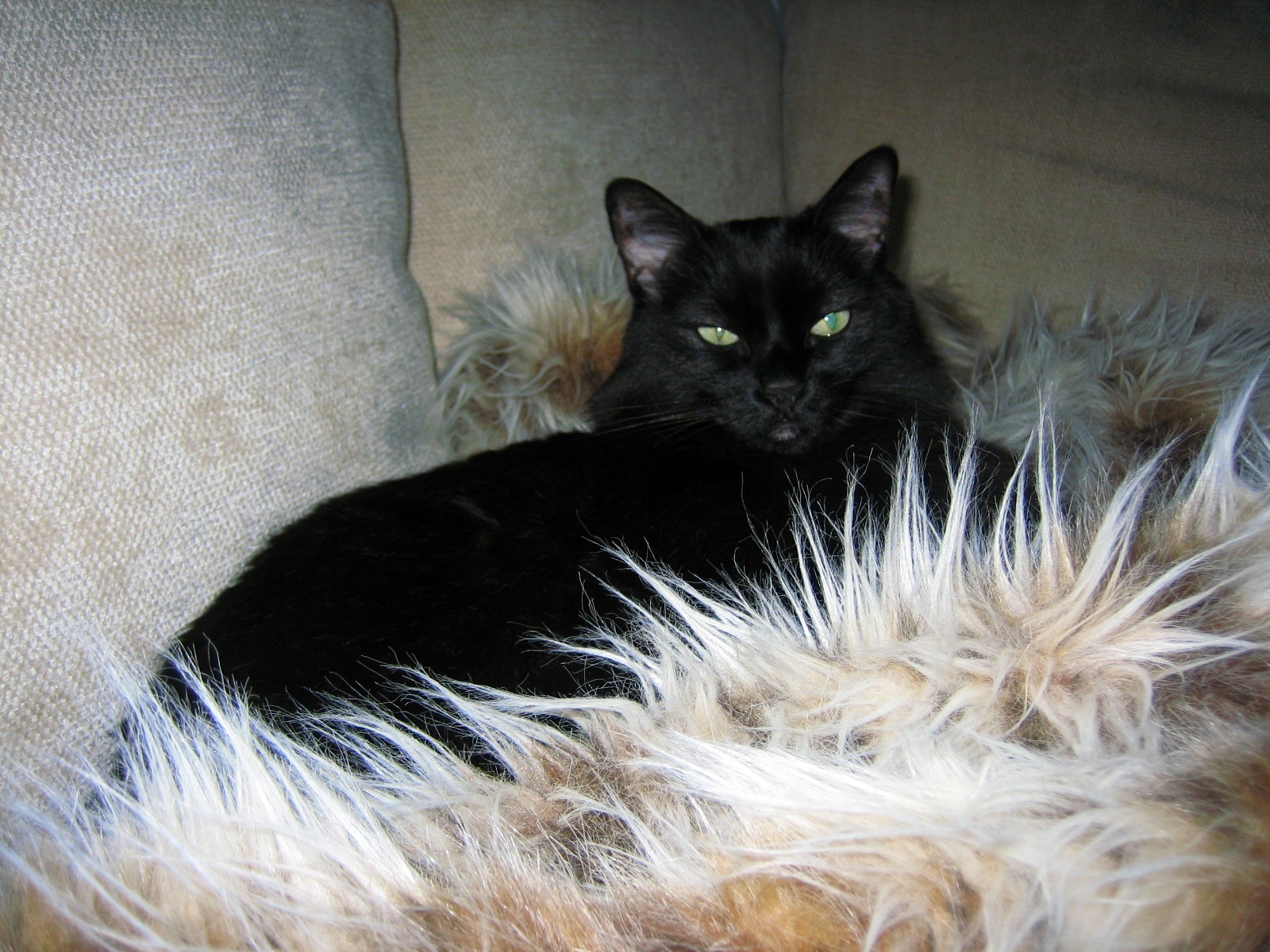 These days, Sophie comes downstairs from her safe room (now dubbed “the baby’s room”) in the evening, and sits with me on the sofa, soaking up the petting and purring contentedly. Sadie sits on her fur throw on the back of the sofa, purring, kneading, and refraining from hissing (most of the time), now that she has made it apparent to Sophie that she is queen and has no intention of ceding her throne. Now that Sadie has reaffirmed her position and has no need to engage with Sophie (most of the time), Sally has decided to take on the number two spot. Currently the two of them participate in frequent altercations, consisting mostly of hissing, and at times yowling and chasing. Sally does the chasing; Sophie runs off to her room. I’d noticed Sally’s aggressive behavior getting worse of late, and then realized the Feliway diffusers were empty. I replaced them with refills, and things seem to have calmed down considerably. I’m fairly certain that stuff is working wonders.