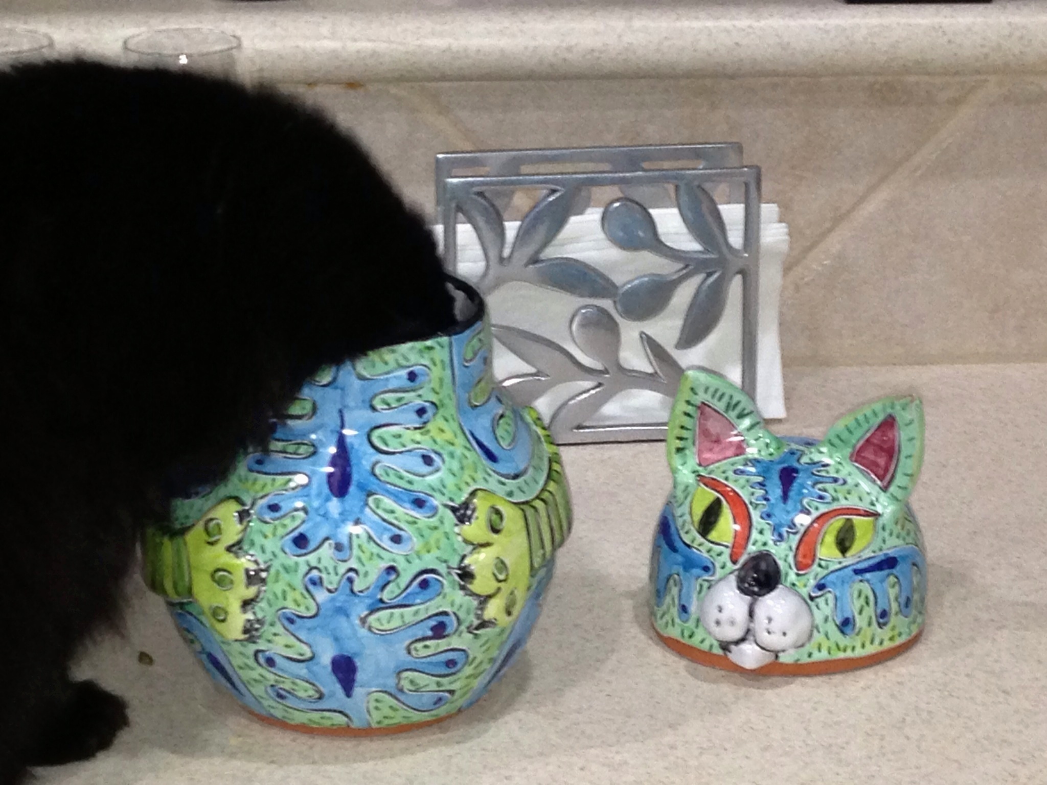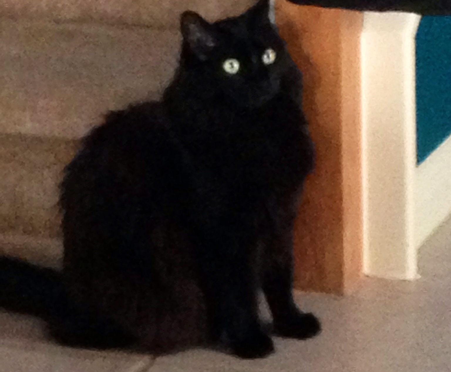 I’m also fairly certain that Sophie, the nutty little adolescent, has not yet taken the prized number two spot. She has, however, begun to join us in the morning for breakfast, in addition to the evening petting. The first time she gave up her ninja appearances and came all the way down the stairs was on the morning of my 50th birthday, nearly a month ago now. She ate tuna from her own little plate, within sight of Sadie and Sally. It was then I knew we would succeed at becoming a fully integrated family of four—me and three fluffy black cats named Sadie, Sally, and Sophie (in size order).