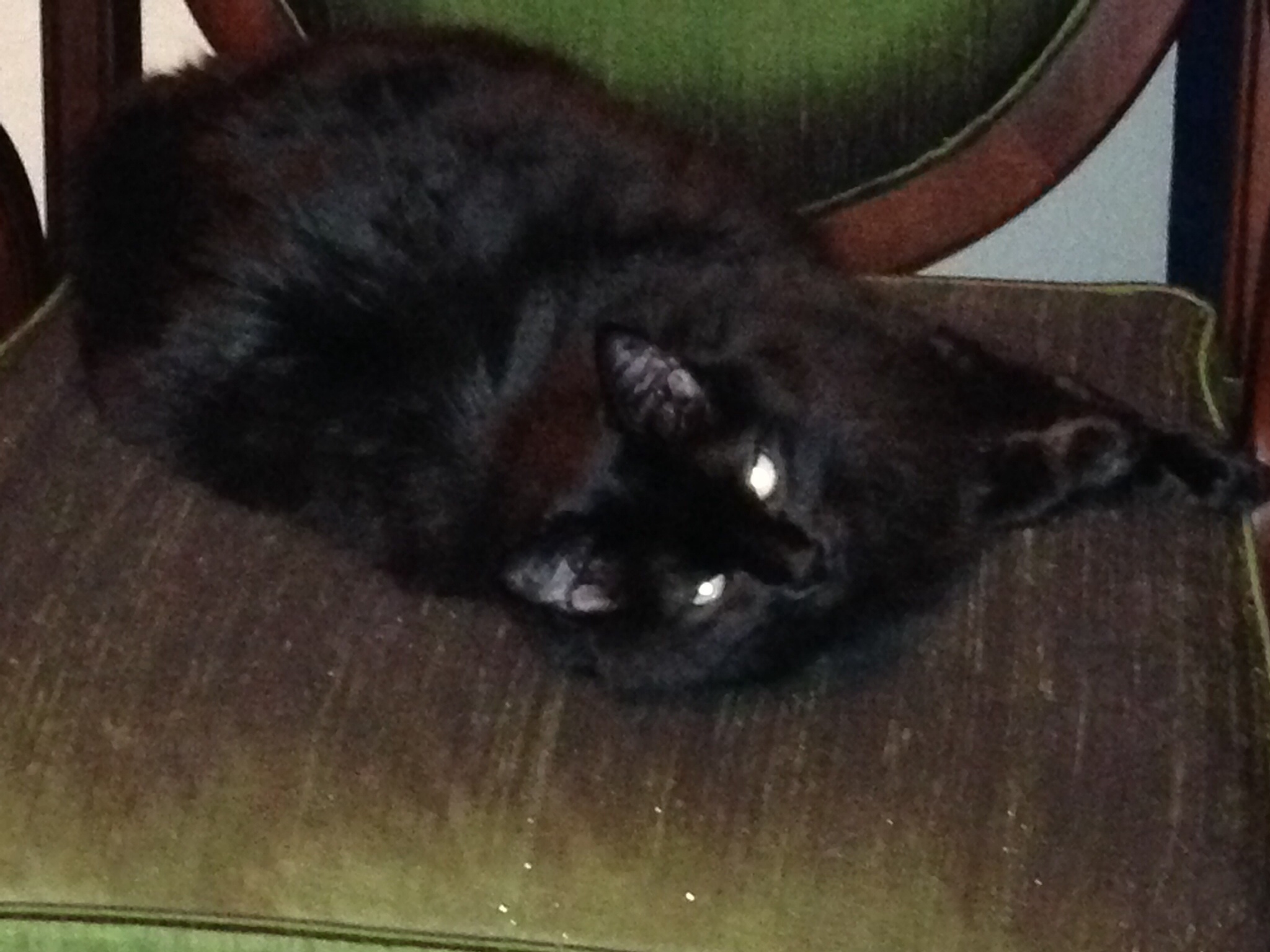 Later, I’ll lie on her sofa, and she’ll jump up immediately, meowing and trilling repeatedly, until she settles herself on my belly. She’ll lie there, purring and drooling, as I tell her what a lucky little cat she is. No hiding from storms or the cold. Or dogs. No scrounging in the trash for food. No matted fur. No protruding bones. No resorting to rubbing against bushes for petting.