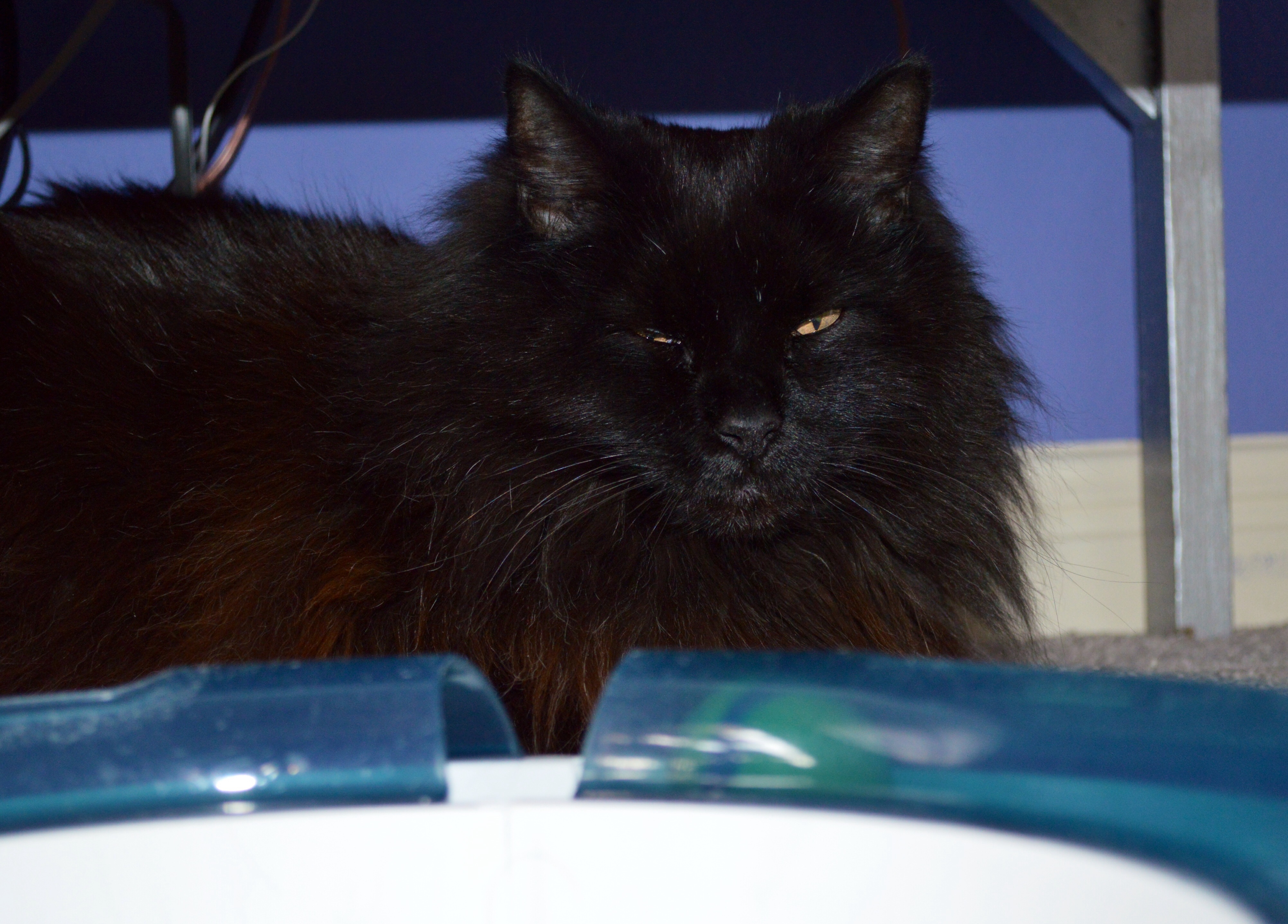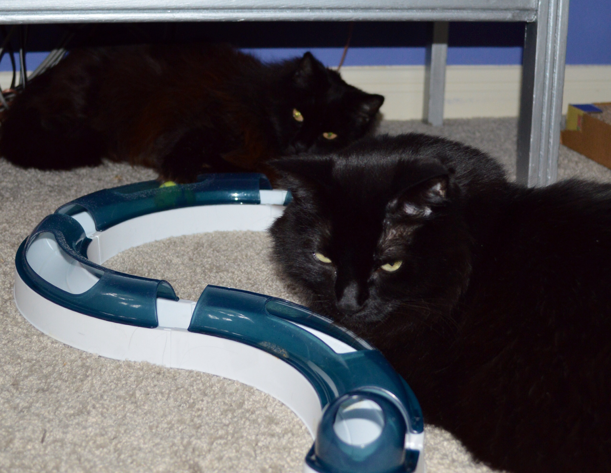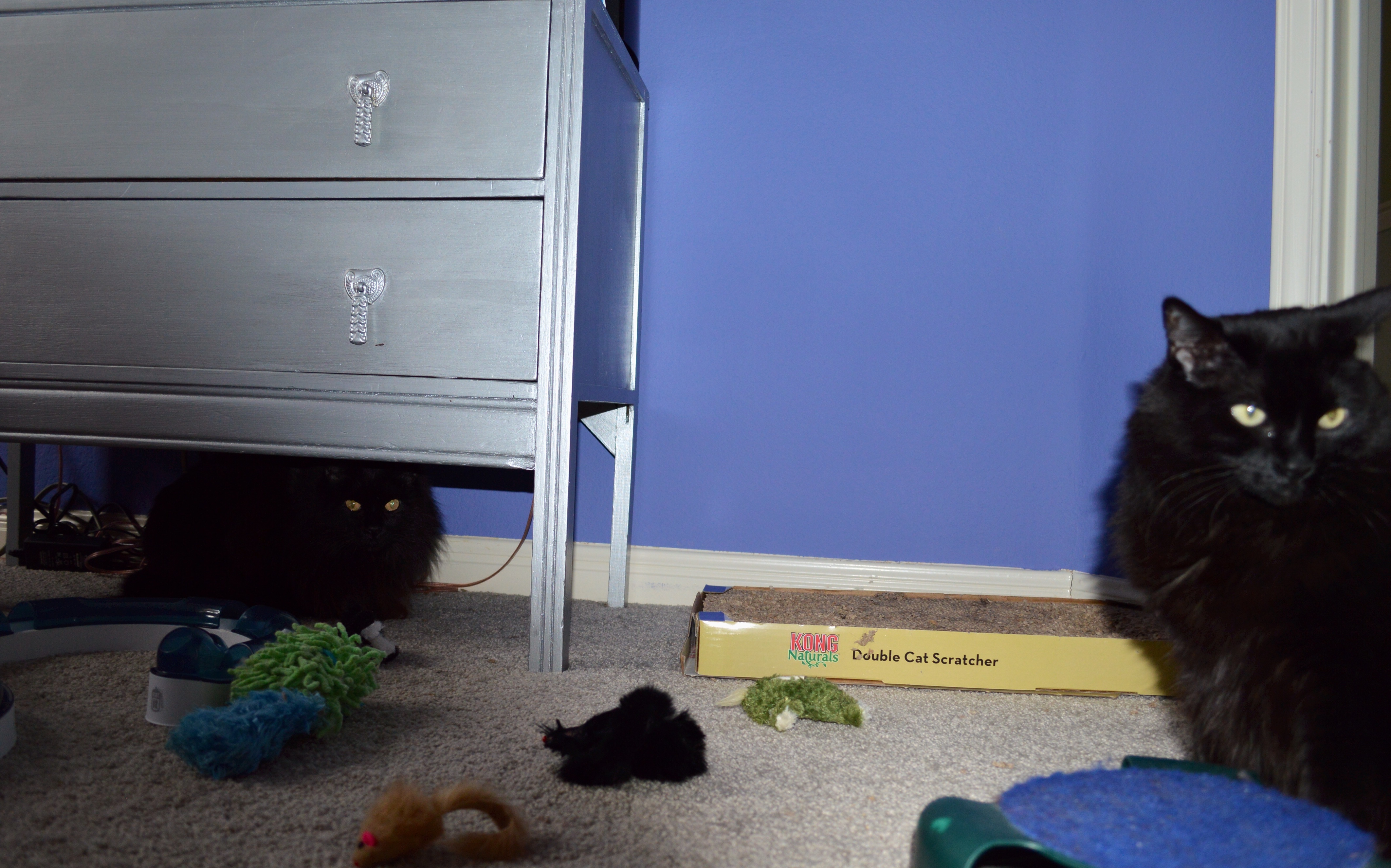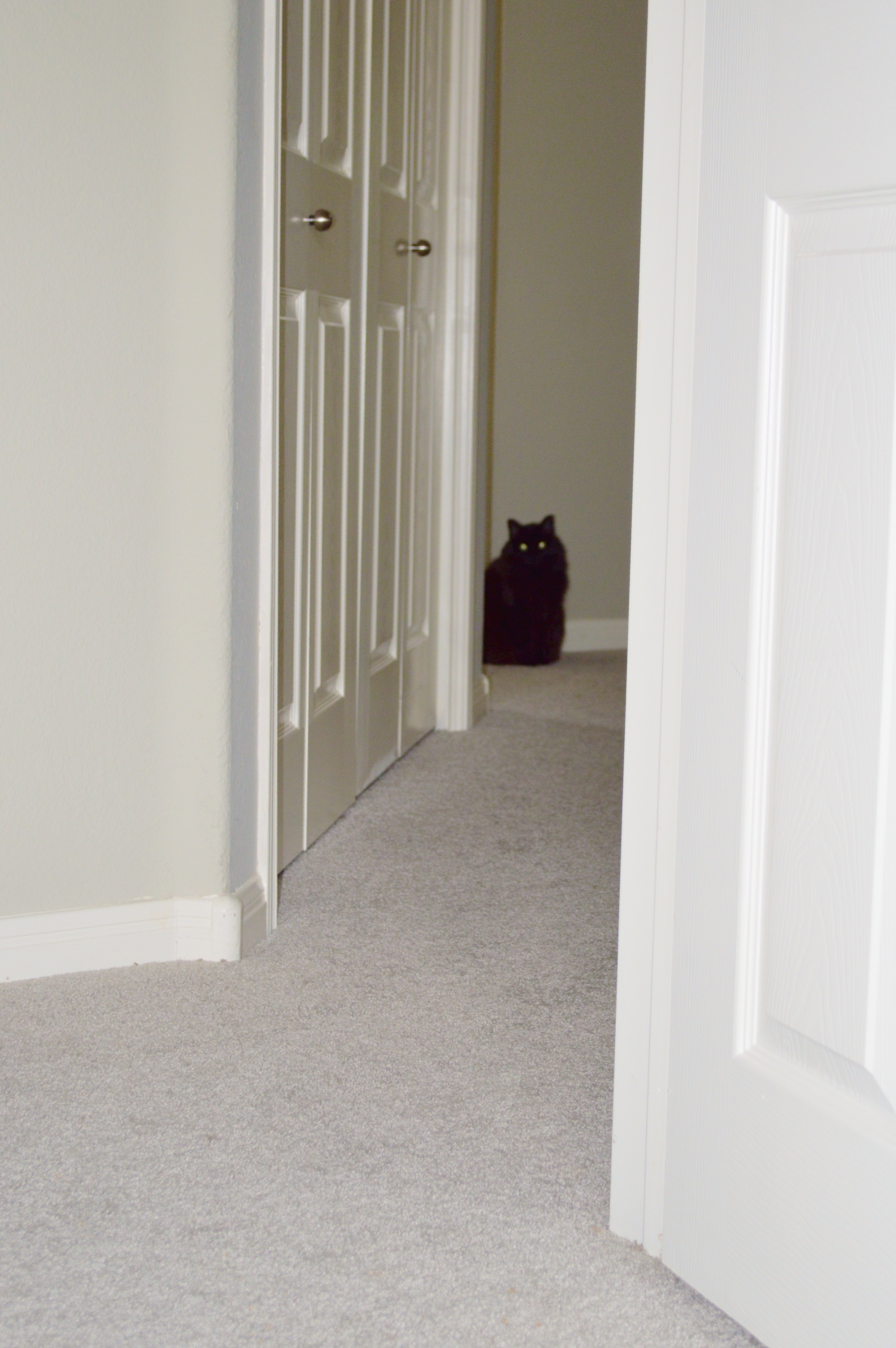 Sally, hiding out in Mom’s room. Maybe she’ll be brave and allow a 3-black-cat photo shoot during year 2.
