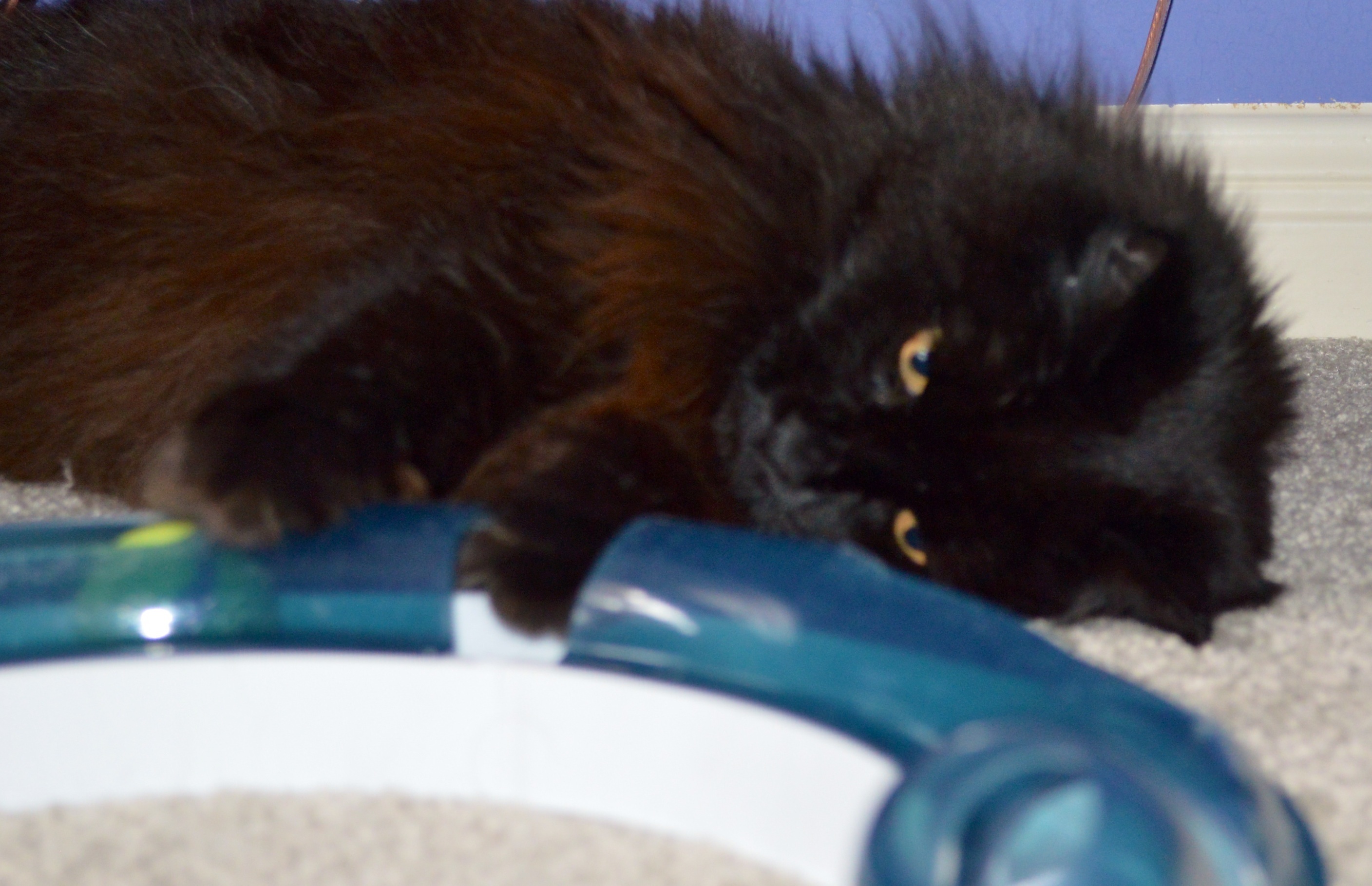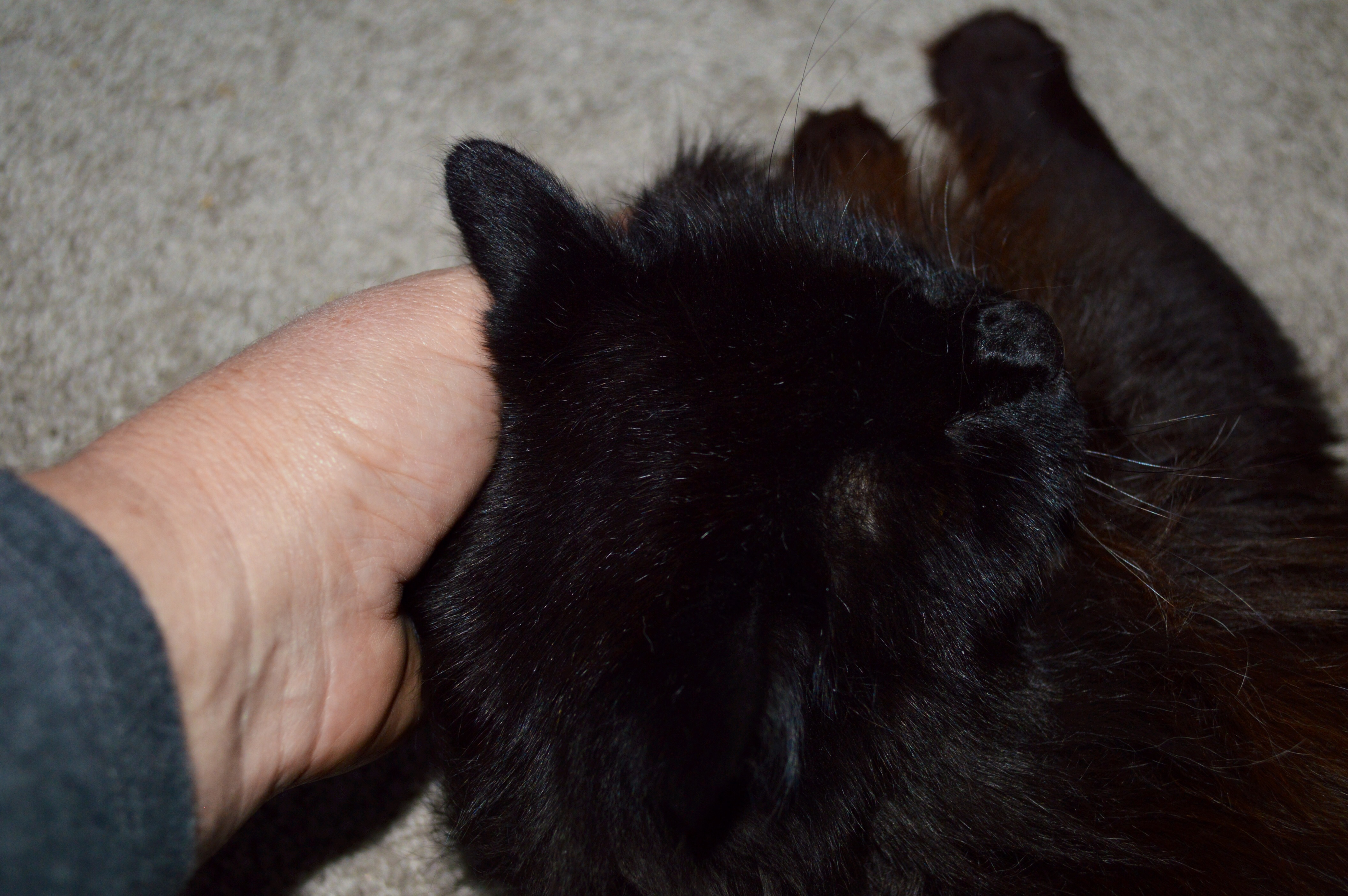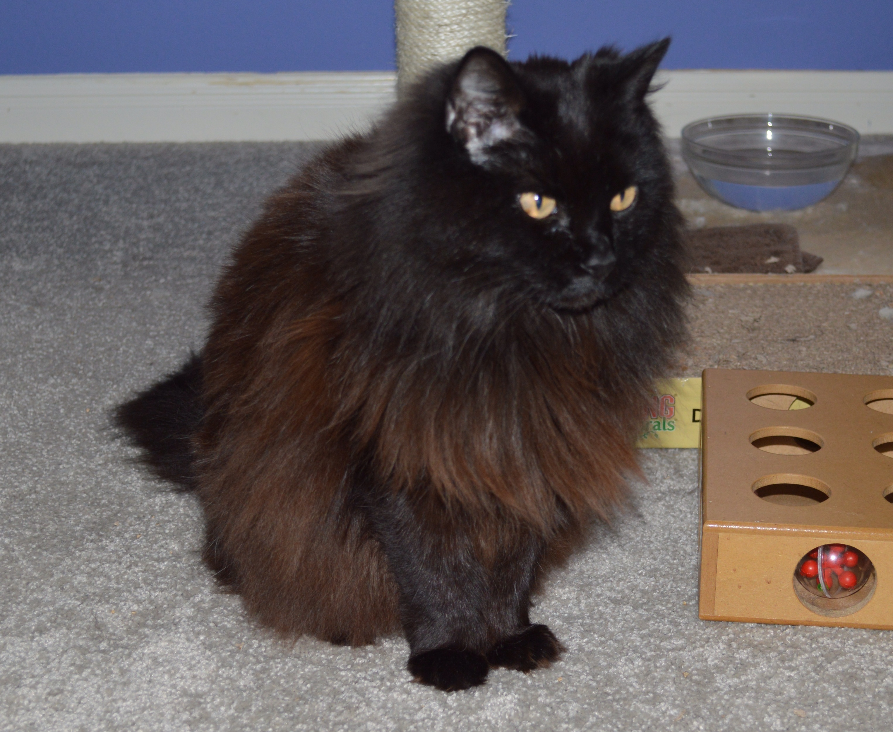 Sally, hiding out in Mom's room. Maybe she'll be brave and allow a 3-black-cat photo shoot during year 2.
