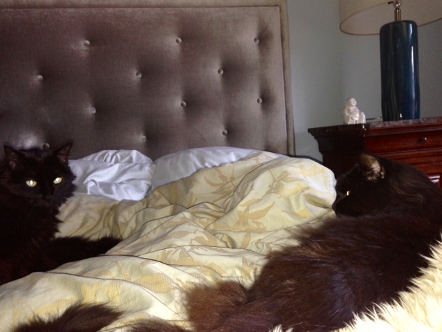 Bottoms Up?Yes, I am a day late. And actually, I didn’t snap this photo until moments ago. But it’s a miracle! Sophie-the-former-stray (right) jumped up onto my (unmade) bed while Sally-the-wicked-stepsister (left) was having a clean. No one growled. Not once. Sally just went right on grooming herself as Sophie stared out the window and purred. Granted, Sophie flattened her ears a bit and swished her tail from time to time. But Sophie’s swishing tail was nearly close enough to Sally’s now pristinely clean tail to touch it. Yes, folks, they almost touched tails! But it didn’t stop there: after Sally finished with her bath, she leaned in and gave Sophie’s tail a sniff. Sophie didn’t bat an eye. Or a tail.
