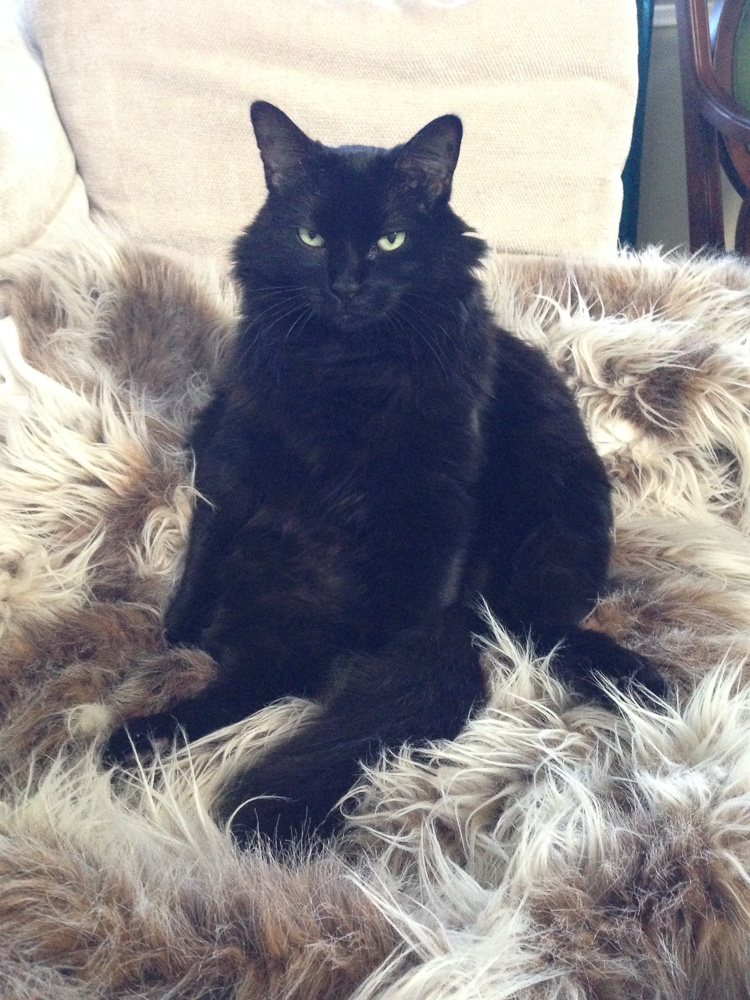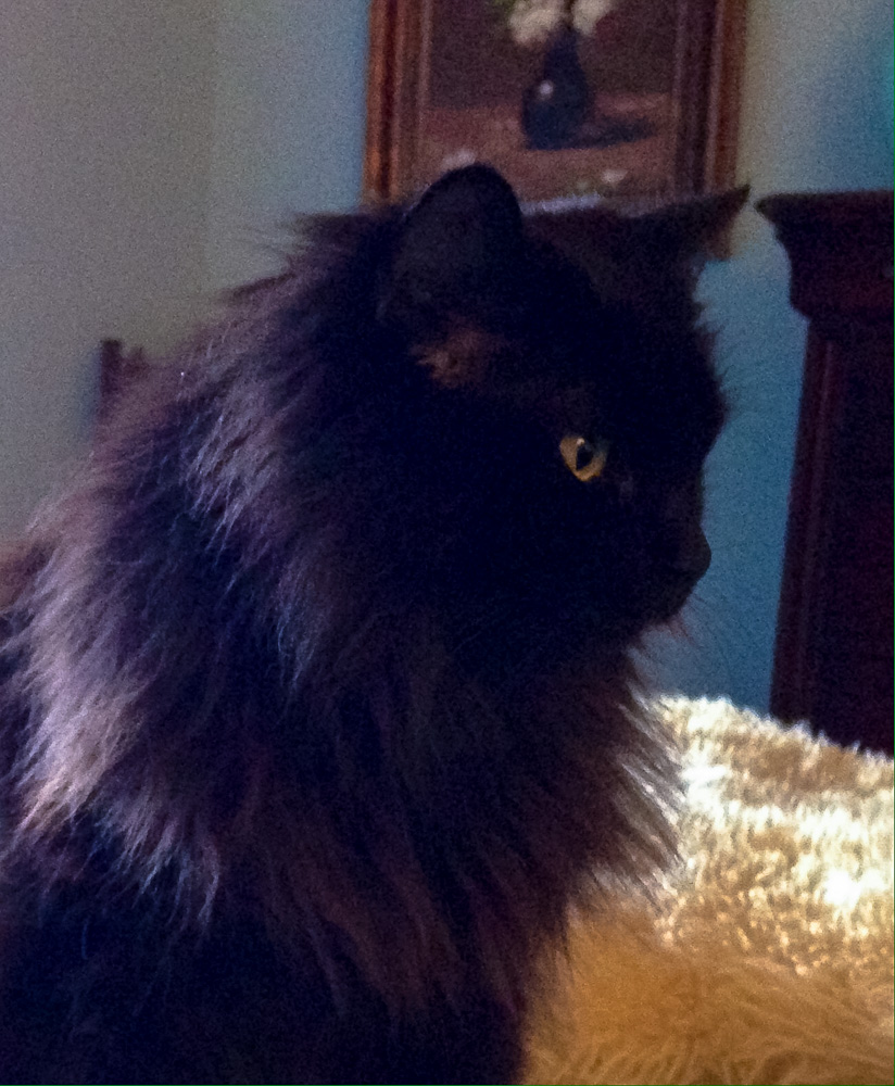 While Sophie matches Sadie and Sally in their black fluffiness, Sophie’s eyes are gold, whereas Sadie’s and Sally’s are green.