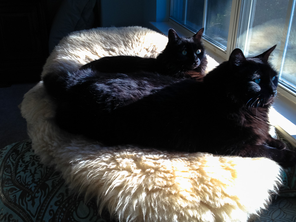 Sally and Sadie, littermates I adopted together from a local shelter ten years ago as little tiny fluffballs, get along well. They are not so tolerant of Sophie, the interloper who joined our black cat family in March 2013, when I brought her in from the cold after three months of wooing her away from her life on the streets.