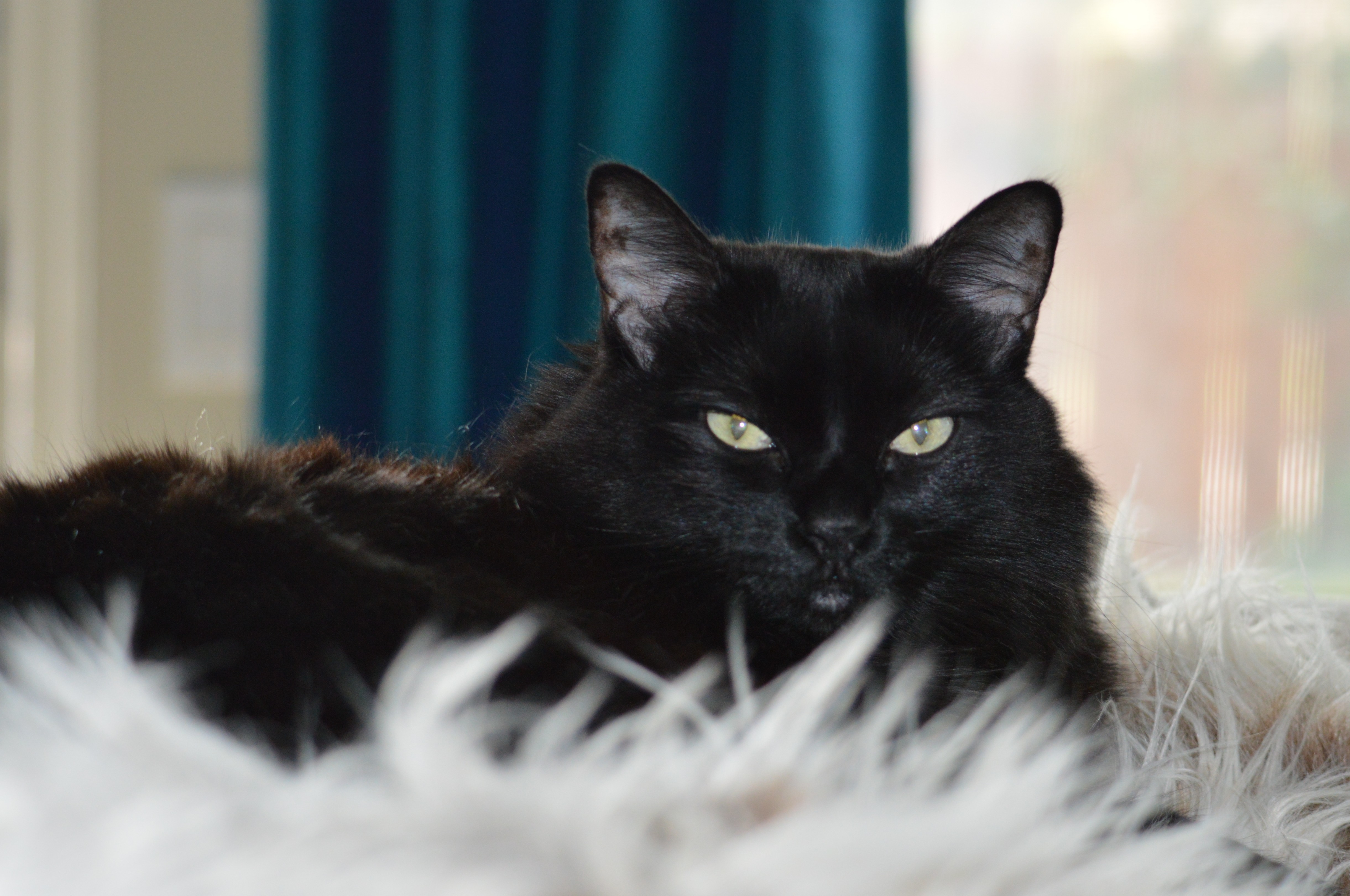 In late 2012, when Sadie and Sally had been enjoying their two-cat household for ten years, scruffy emaciated Sophie showed up on our doorstep. Like Sadie and Sally, Sophie was fluffy and black. Unlike Sadie and Sally, her coat was dull and matted. After three months of wooing with tuna and Greenies, she came in from the cold and joined our Black Cat Troupe. Now, three years later, her coat is soft and lustrous, and she no longer runs to cower in the corner at the slightest movement or sound. In fact, Sophie has become quite the cuddler.